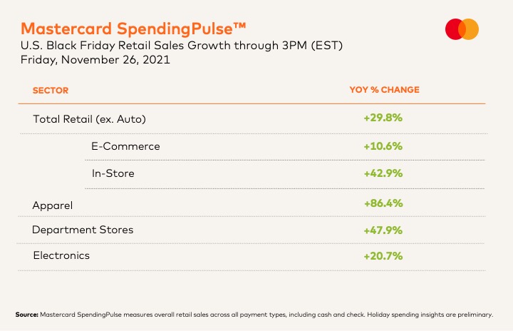 “Retail spending has been on the rise throughout the day,” said Steve Sadove, senior advisor for Mastercard and former CEO and Chairman of Saks Incorporated. “As of 3PM today, Mastercard SpendingPulse reports that total retail sales are up nearly 30% compared to last year, with Apparel and Department Store sales leading the way.”