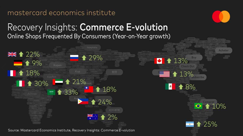 Roughly 20-30% of the Covid-related shift to digital globally is expected to be permanent, according to Mastercard’s Recovery Insights: Commerce E-volution. The report draws on anonymized and aggregated sales activity in the Mastercard network and proprietary analysis by the Mastercard Economics Institute. The analysis dives into what this means by country and by sector, for goods and services, and within countries and across borders.