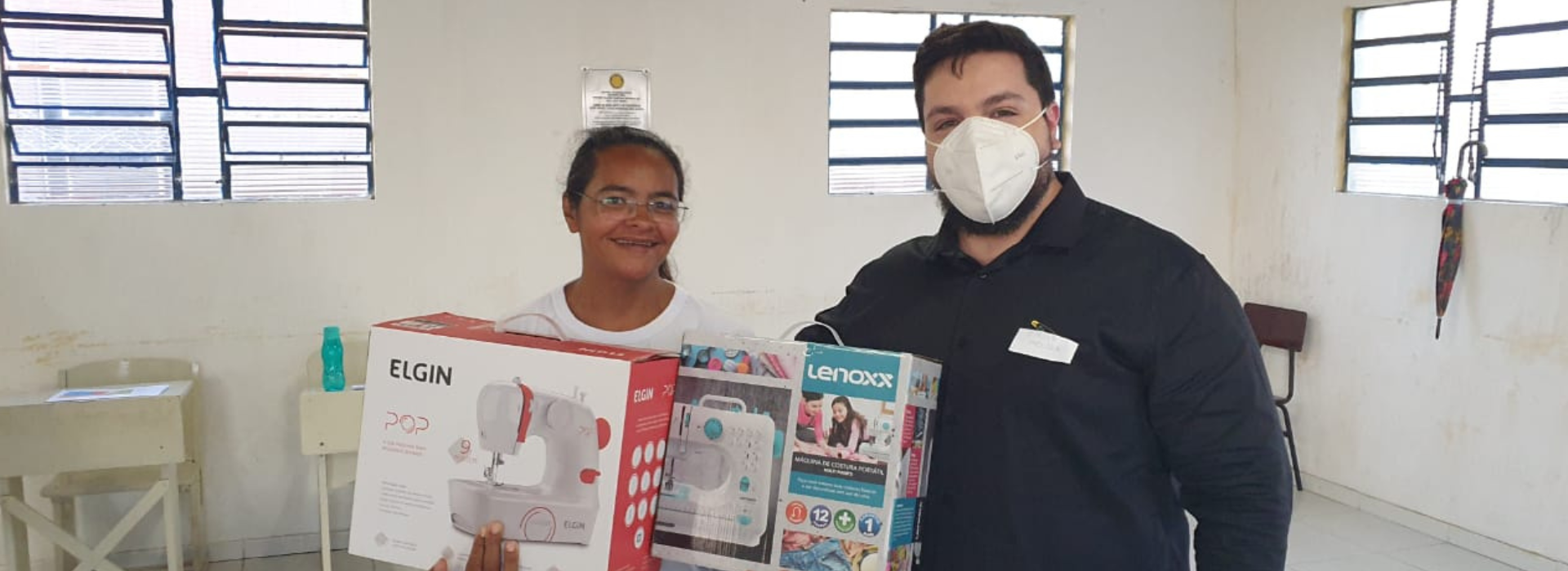 Banner photo: Philipe Moura presents Dona Preta with sewing machines and donated fabric for clothes she and her sewing collective will make for their community. (Photo courtesy of Philipe Moura)
