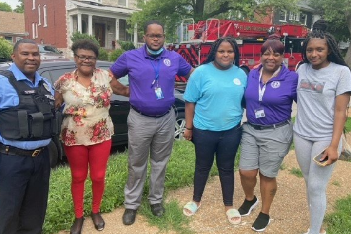 Clinician Randall Richardson, third from left, and peer counselor Patricia Johnson, second from right, helped a St. Louis family in crisis through the city's new initiative that pairs police officers with counselors. (Photo courtesy of Behavioral Health Response)