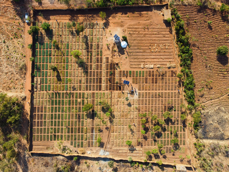 A drone view of one of the nonprofit's nurseries, where community members are nurturing nearly 20 varieties of seedlings. (Photo courtesy of Wells for Zoë)