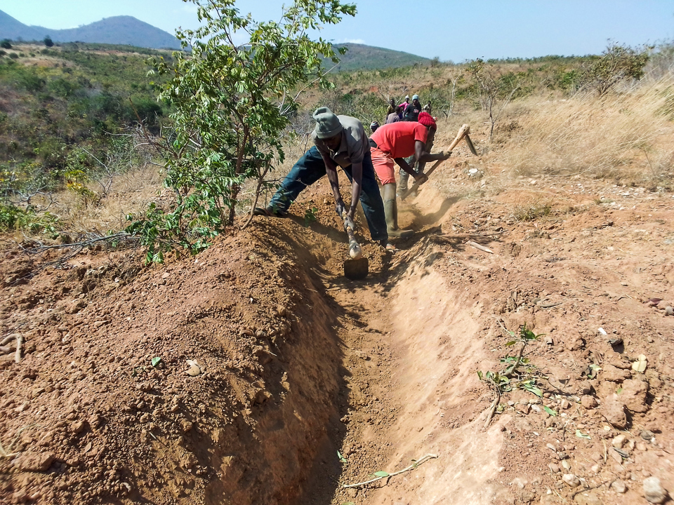 Digging contour berms like these trap large amounts of rainwater and reduce the runoff loss — both water and soil — from the site. After a rain, hundreds of thousands of liters of water that would typically not infilitrate and nourish the soil are trapped in these berms and can slowly seep into the often over-hardened soil. This can also improve access to drinking water in dry season. (Photo courtesy of Wells for Zoë)