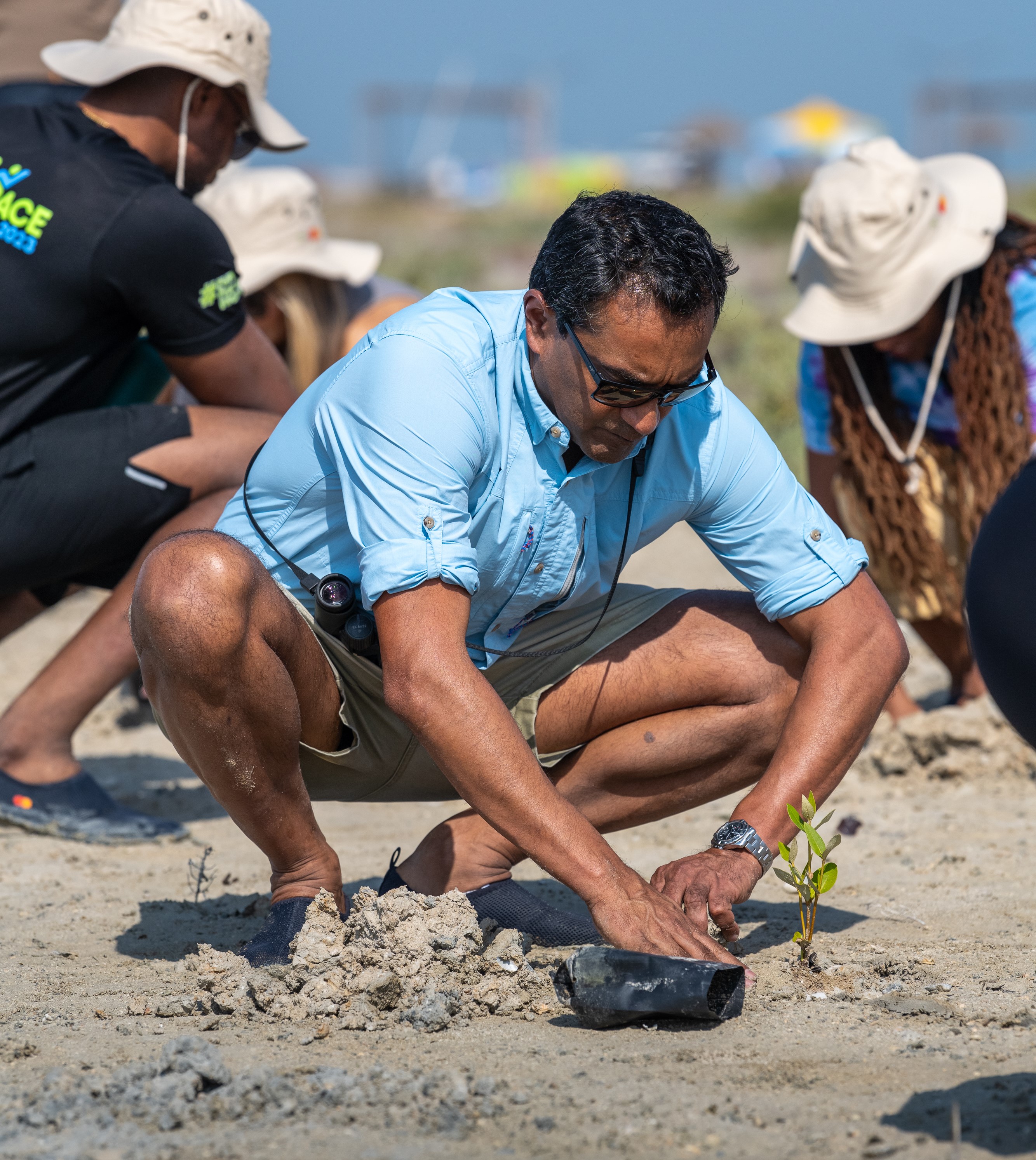 Conservation International CEO M. Sanjayan joined other sustainability leaders on a field visit to Mangrove Beach during COP28, seeing firsthand the carbon-storing power of mangrove forests and planting saplings at the site.
