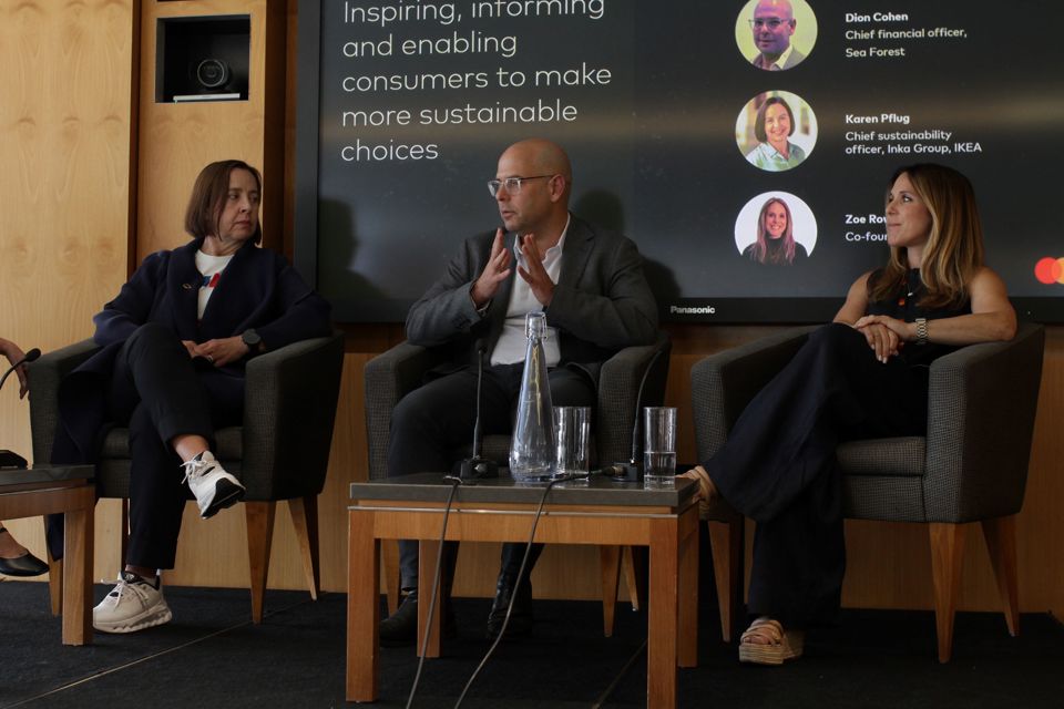 Karen Pflug, Ingka Group's chief sustainability officer, left, Dion Cohen, the chief financial officer for Sea Forest, center, and Zoe Rowswell, the co-founder of Tern Eco, shared insights on helping consumers make more sustainable purchasing decisions.