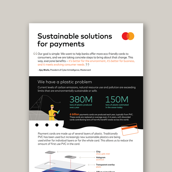 More than three quarters of people say they are “very concerned”[1] about the environment and feel companies should be doing more to address their impact on the planet[2]. As consumers look for ways to help tackle climate change through their own positive actions, many are limiting their use of single-use plastics. To address this growing concern, Mastercard has worked with global industry players to develop a sustainable card program for all card issuers globally. A new directory of sustainable materials and vendors for card products aims to make sustainable choice the preferred option for all financial institutions worldwide and drive enhanced innovation.
