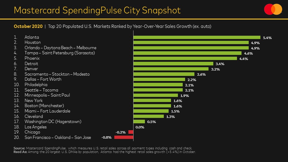 This holiday season, shopping early, online and local is top of mind for many. But what this looks like on the ground varies – with the recovery playing out very differently from community to community. An analysis from Mastercard SpendingPulse™, which measures retail sales across all payment types including cash and check, reveals that Atlanta, Houston, and Orlando are the metropolitan areas leading the road to retail recovery in October.