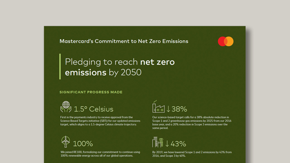 Mastercard’s net zero goal builds upon its existing GHG commitments that align with the Business Ambition for 1.5°C pledge. The first in the payments industry to gain Science Based Targets initiative (SBTi) approval for its GHG goals, Mastercard is currently working towards its SBTi-approved goal to reduce total Scope 1 and 2 emissions by 38% and Scope 3 emissions by 20% by 2025 from a 2016 baseline.