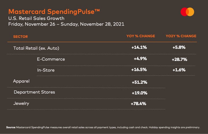 November 29, 2021Shoppers drove U.S. retail sales during Thanksgiving weekend up +14.1% year-over-year and +5.8% compared to 2019, excluding auto. According to Mastercard SpendingPulse™, which measures overall retail sales across all payment types including cash and check, in-store sales rebounded, increasing +16.5% YOY while e-commerce sales experienced sustained growth up +4.9% YOY for the weekend running Friday, November 26 through Sunday, November 28.