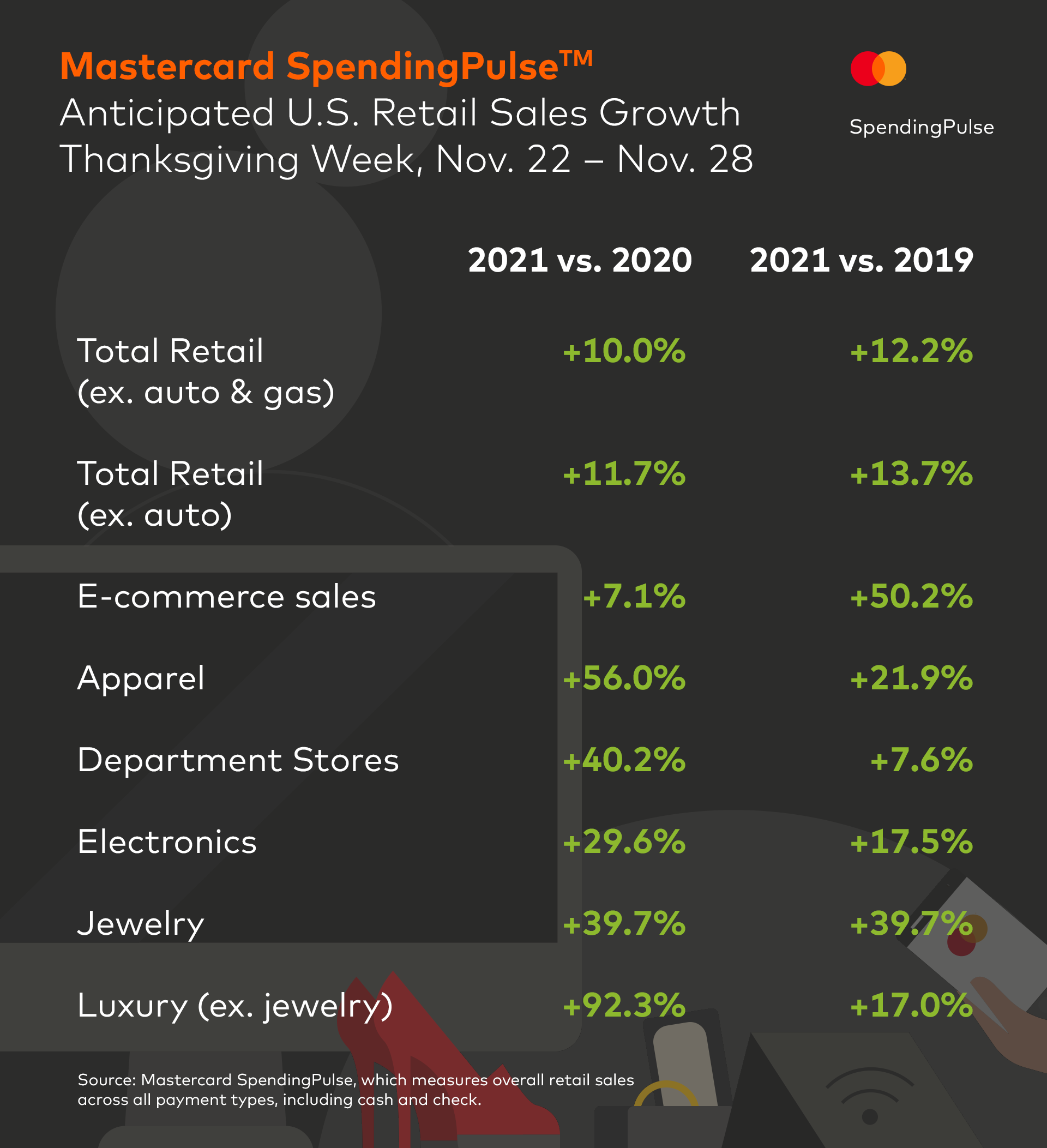 Mastercard SpendingPulse reports on national retail sales across all payment types in select markets around the world. The findings are based on aggregate sales activity in the Mastercard payments network, coupled with survey-based estimates for certain other payment forms, such as cash and check.