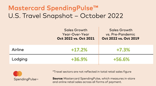 As anticipated, early holiday promotions drove consumers online and into stores. According to Mastercard SpendingPulse, October U.S. retail sales excluding automotive increased 9.5% year over year and 23.6% compared to October 2019. E-commerce sales in October grew 12.7% YOY and 96.0% YO3Y. Experiential sectors including Restaurants, Airlines and Lodging all saw double-digit growth compared to both 2021 and 2019.